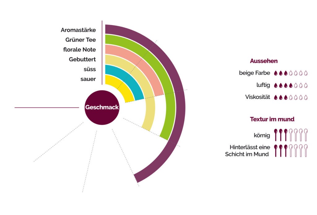 Das ‚Les vergers Boiron‘ Birnenpüree enthält aromatische Noten von anderen Obstgartenfrüchten (z. B. Apfel), trockene Noten mit Anklängen an grünen Tee und karamellisierte Noten. Die körnige Konsistenz im Mundgefühl spiegelt die charakteristische Beschaffenheit der Birne wider.
