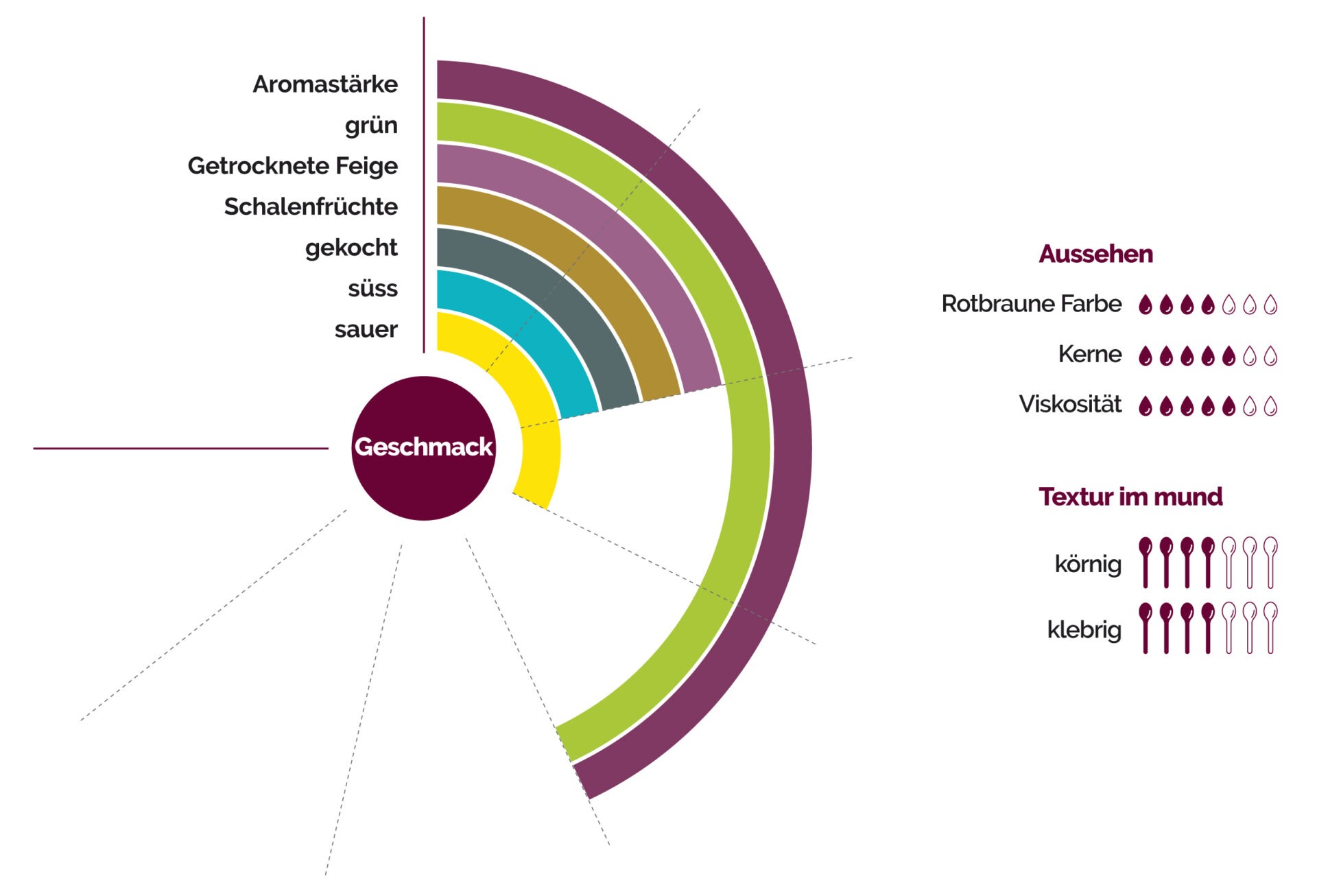 Bei der Verkostung offenbaren sich die aromatischen Eigenschaften der frischen Frucht: Die säuerlichen und pflanzlichen Noten werden mit dem natürlich süßen Geschmack der reif gepflückten Feigen ausgeglichen. Bei einer eingehenderen Analyse finden sich Noten von Trockenfrüchten wie Maronen.