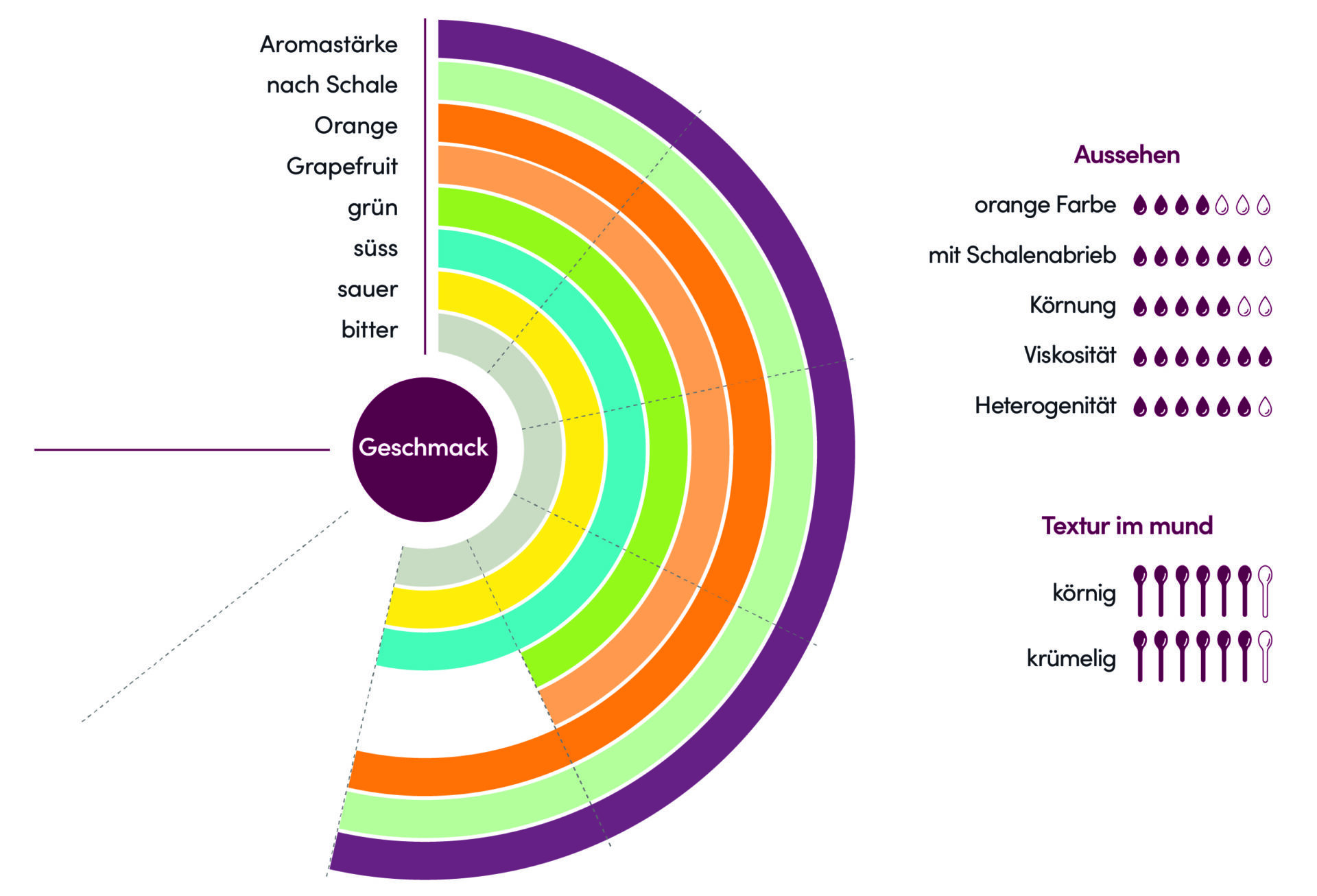 Dieses Püree entfaltet eine starke Geschmacksintensität mit einem ausgewogenen Verhältnis zwischen Süße und Bitterkeit. Man erkennt zestige Noten sowie die Noten anderer Zitrusfrüchte wie Orange und Grapefruit.
