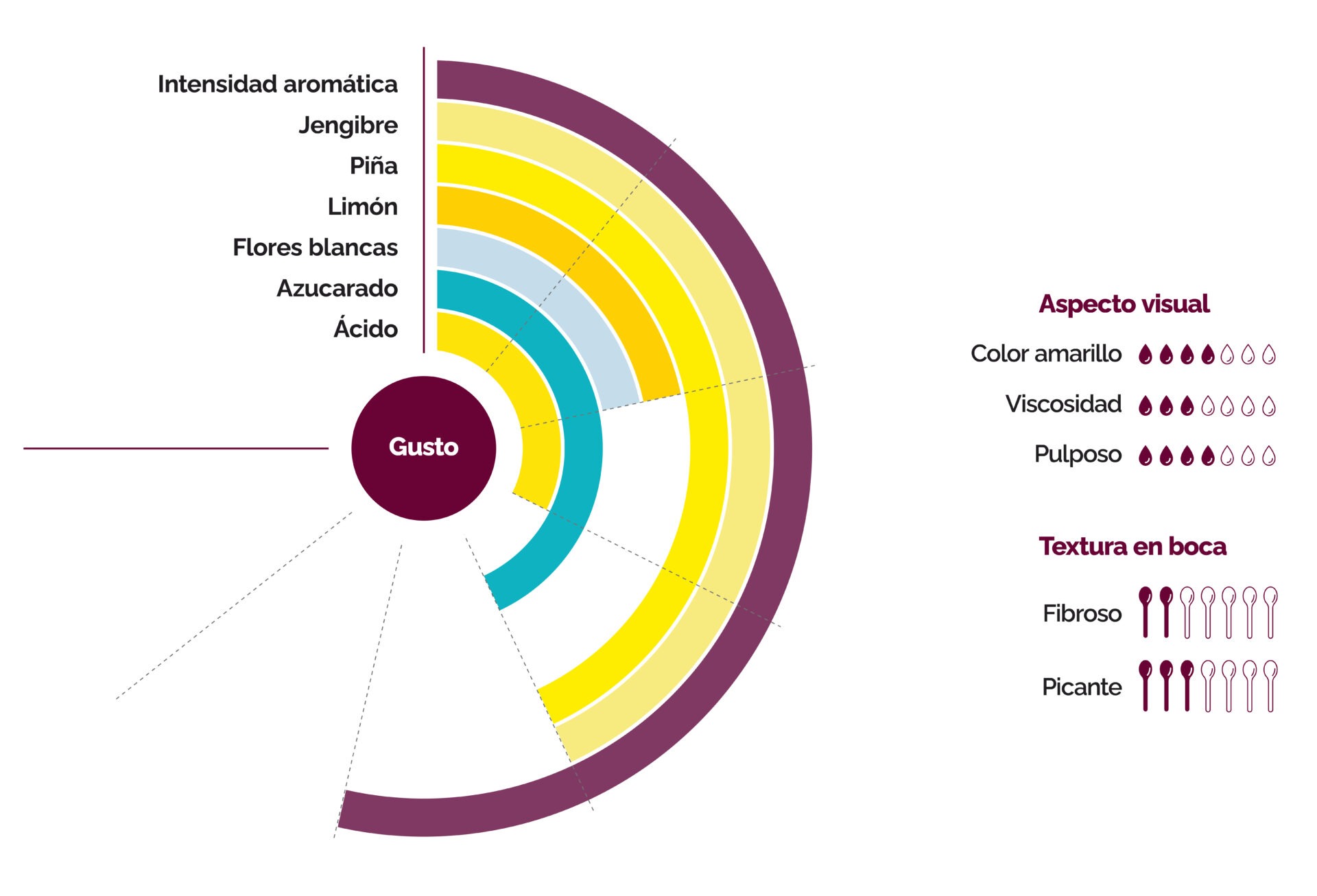 El puré azucarado especialidad con jengibre de Les vergers Boiron se elabora con una mezcla de piña de Costa Rica, limón amarillo de Italia y jengibre de China y Fiyi.
