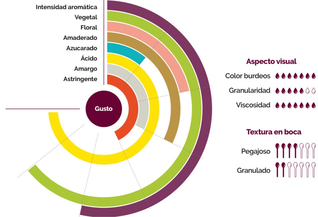 Un producto potente por su textura espesa y su complejidad aromática rica en notas florales y tánicas.