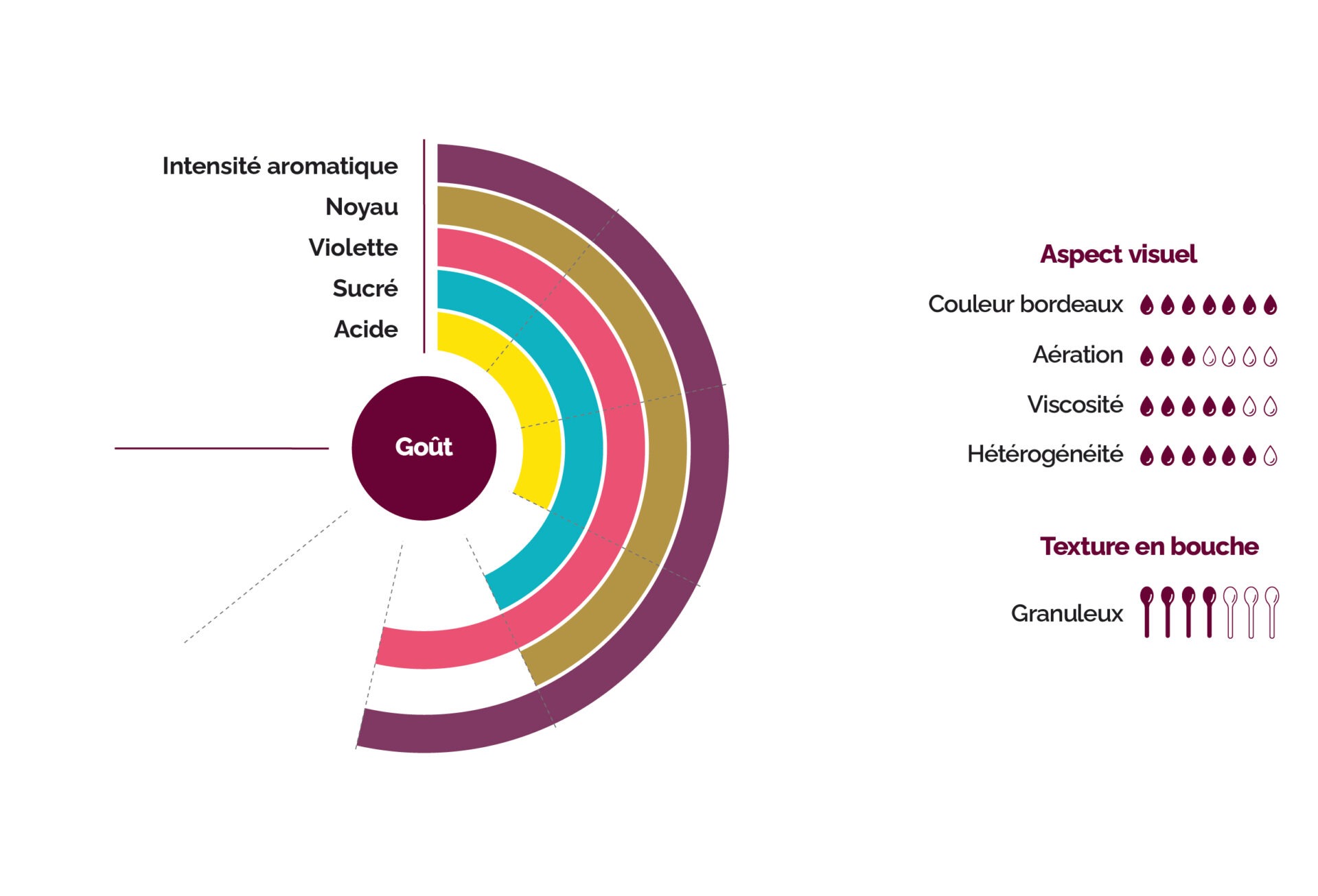 D’une grande richesse aromatique, la purée de cerise noire de Bâle est caractérisée par la saveur naturellement sucrée du fruit, enrichie de notes acides auxquelles viennent s’ajouter de puissantes notes florales de violette et des notes d’amande amère provenant de la présence du noyau lors de la transformation.