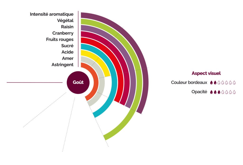 L’assemblage des variétés Wonderful et Mollar offre un équilibre aromatique unique. La puissance de la Wonderful est adoucie par la douceur de la Mollar, avec des notes végétales et fruitées de fruits rouges, raisin et cranberry.