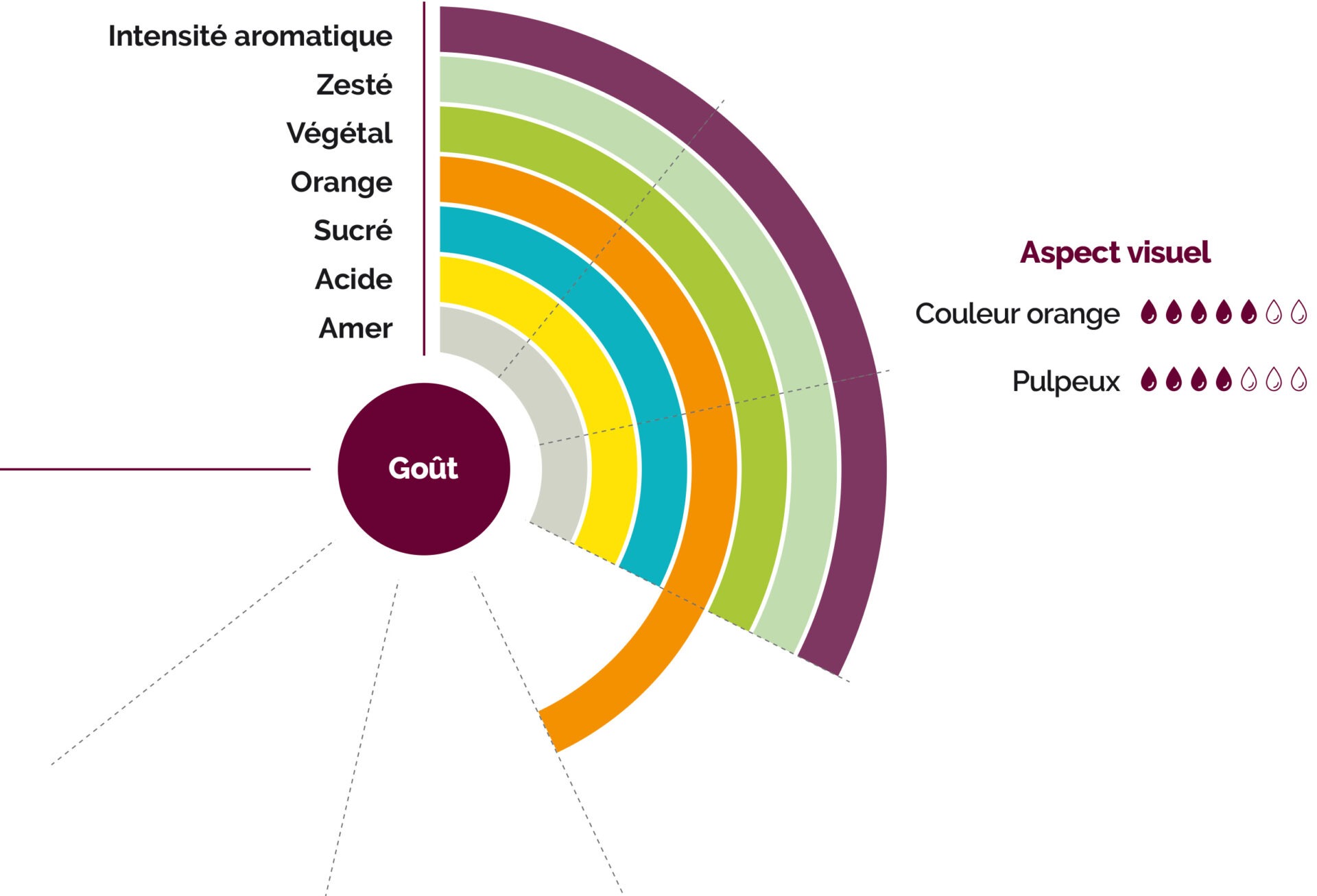 Le choix des fruits récoltés à pleine maturité ainsi que la précaution accordée pour les presser permet d’obtenir un jus avec un bon équilibre entre les saveurs sucrée, acide et amère. Les huiles essentielles présentes dans l’écorce et la chaire du fruit apportent des notes zestées.