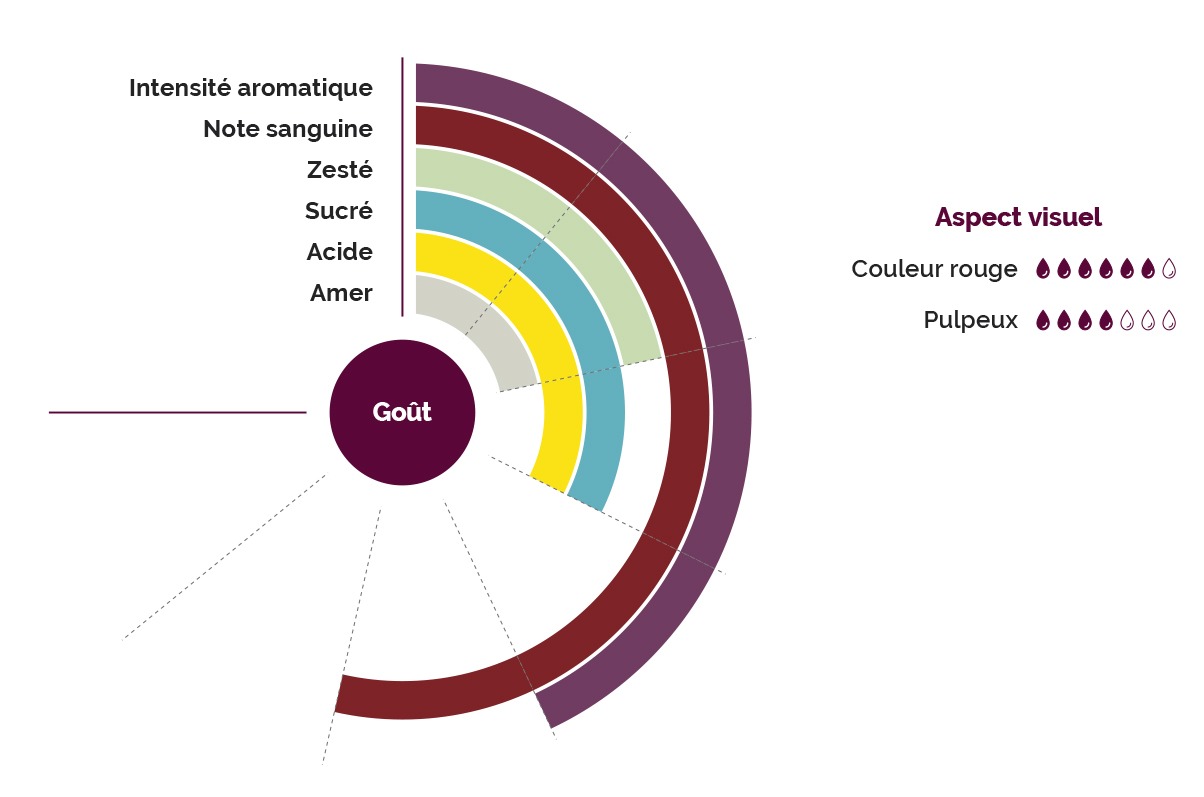 Si la Moro apporte la couleur rouge, la Tarocco apporte l’équilibre sucre/acide. On retrouve dans cette purée toute la typicité de la note sanguine.