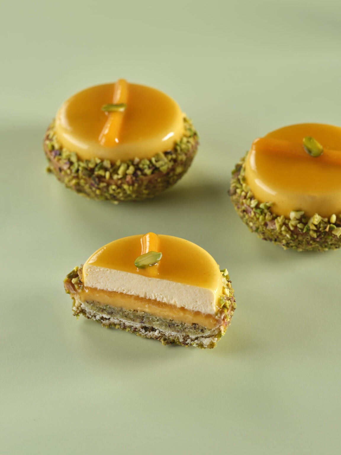 Pocher 15g de crème d’amande pistache dans les fonds de tarte à mi-cuisson, et terminer la cuisson jusqu’à coloration.